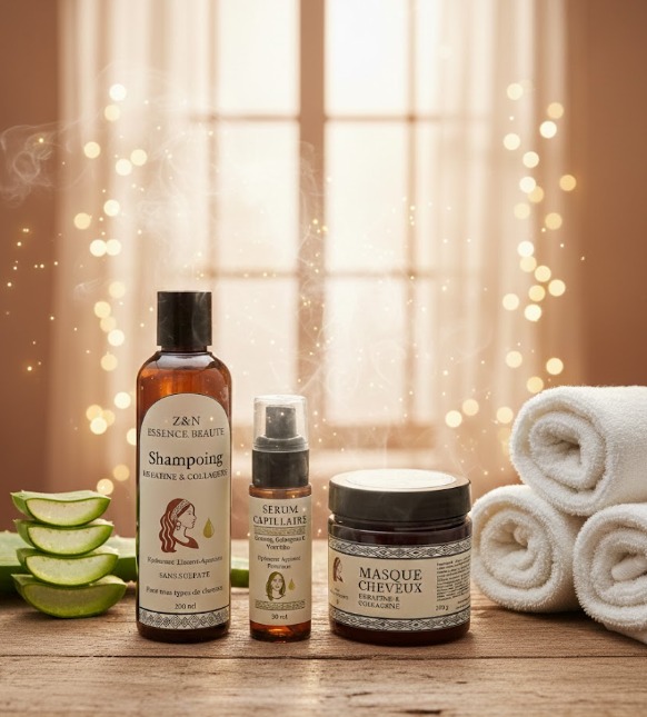 Découvrez notre rituel capillaire naturel signé Z&N Essence Beauté, spécialement conçu pour redonner force, éclat et douceur à vos cheveux. Ce kit premium regroupe trois soins essentiels formulés à base de kératine et collagène, deux actifs reconnus pour réparer, lisser et revitaliser la fibre capillaire.